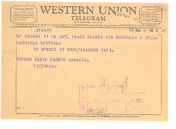 [Telegrama] 1955 ago. 9, Buenos Aires, [Argentina] [a] Gabriela Mistral, Roslyn Harbor [manuscrito] Victoria Ocampo.
