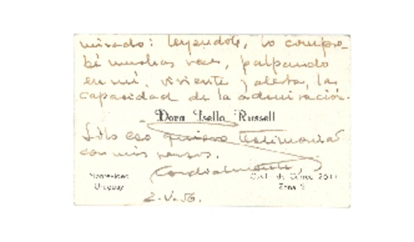 [Tarjeta] 1956 may. 2, Montevideo, Uruguay [a] Joaquín Edwards Bello [manuscrito] Dora Isella Russell.