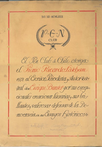 [Diploma] 1972 dic. 16, Santiago, Chile [a] Enrique Bunster [manuscrito] PEN Club de Chile.
