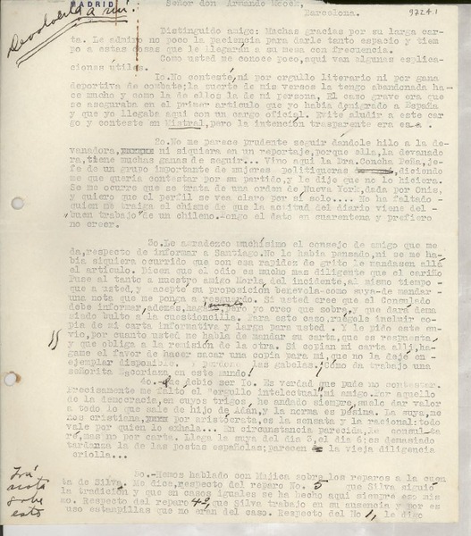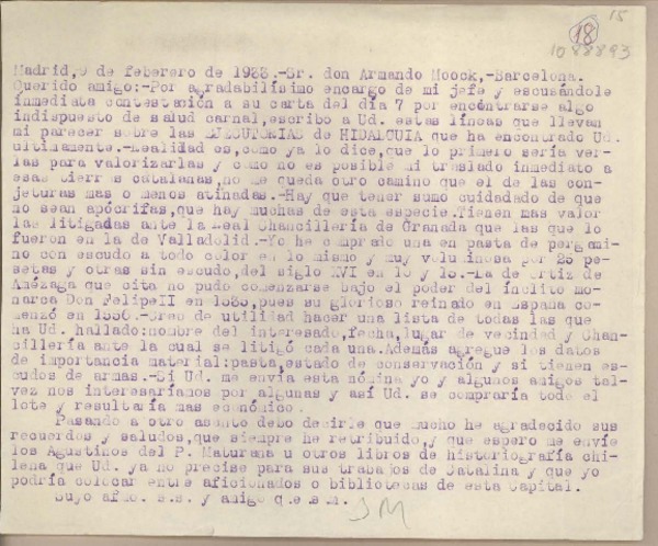 [Carta] 1933 febrero 9, Madrid, España [a] Armando Moock, Barcelona [manuscrito] Juan Mujica de la Fuente.