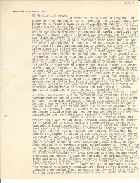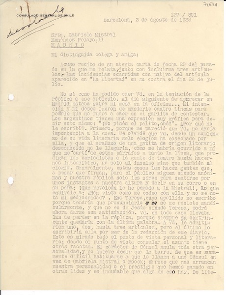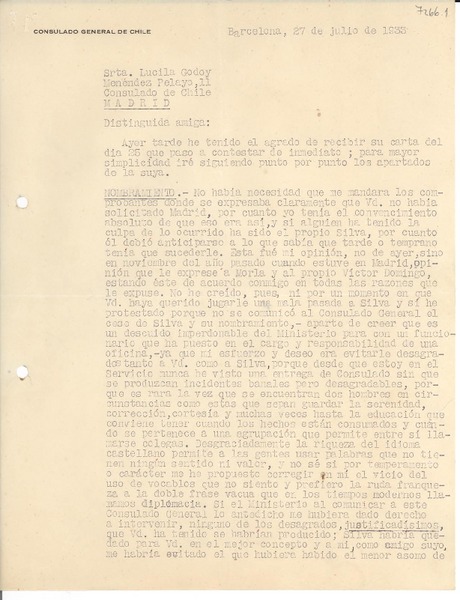 [Carta] 1933 jul. 27, Barcelona, [España] [a] Lucila Godoy, Consulado de Chile, Madrid [manuscrito] [Armando] Moock.