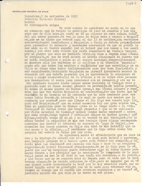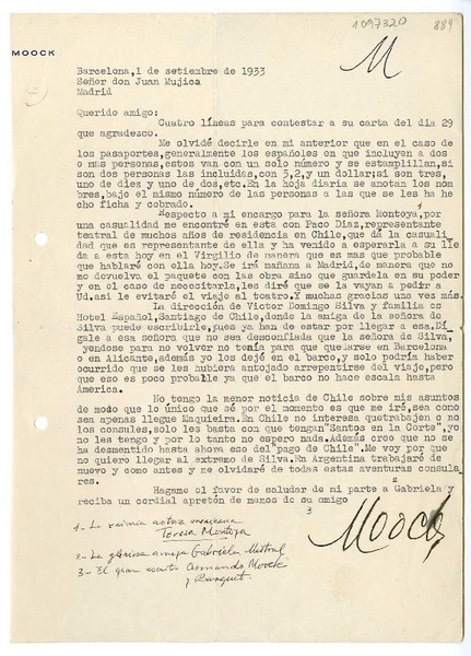 [Carta] 1933 sept. 9, Barcelona, [España] [a] Gabriela Mistral, Madrid [manuscrito] [Armando] Moock.