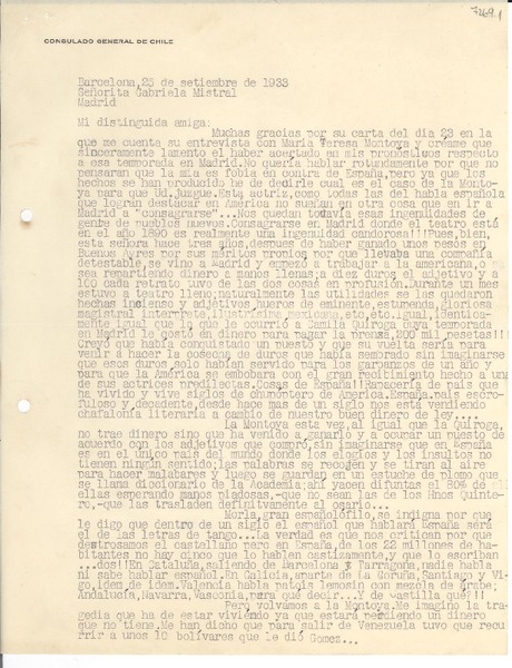 [Carta] 1933 sept. 25, Barcelona, [España] [a] Gabriela Mistral, Madrid [manuscrito] [Armando Moock].