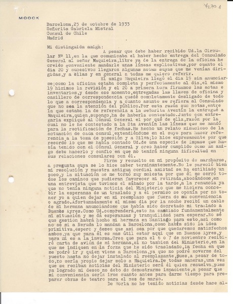[Carta] 1933 oct. 25, Barcelona, [España] [a] Gabriela Mistral, Madrid, [España] [manuscrito] [Armando] Moock.