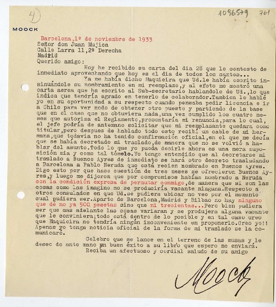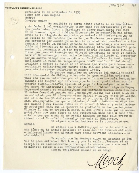 [Carta] 1933 noviembre 10, Barcelona, España [a] Juan Mujica de la Fuente, Madrid [manuscrito] Armando Moock.