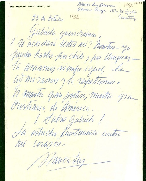 [Carta] 1952 oct. 23, Santiago [a] Gabriela Mistral [manuscrito] Blanca Luz Brum.
