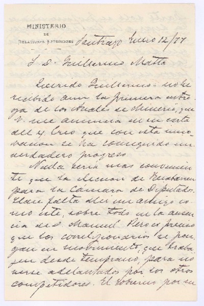 [Carta] 1877 ene. 12, Santiago, Chile [a] Guillermo Matta [manuscrito] Fabio Alfonso.