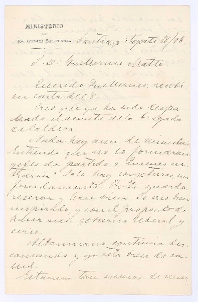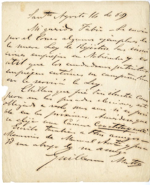 [Carta] 1869 agosto 16, Santiago, Chile [a] Fabio Alfonso [manuscrito] Guillermo Matta.