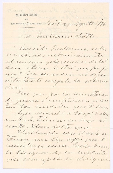 [Carta] 1876 ago. 8, Santiago, Chile [a] Guillermo Matta [manuscrito] Fabio Alfonso.