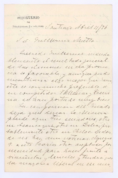 [Carta] 1876 abr. 4, Santiago, Chile [a] Guillermo Matta [manuscrito] Fabio Alfonso.