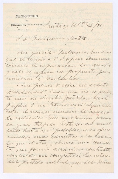 [Carta] 1875 oct. 26, Santiago, Chile [a] Guillermo Matta [manuscrito] Fabio Alfonso.