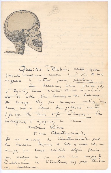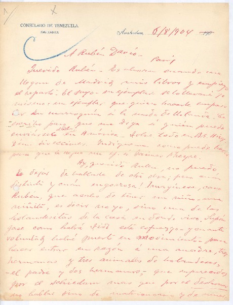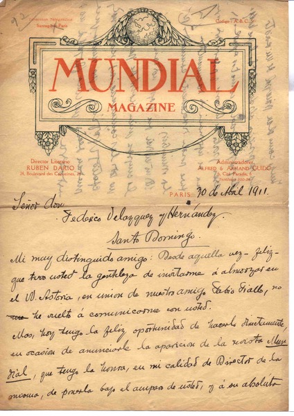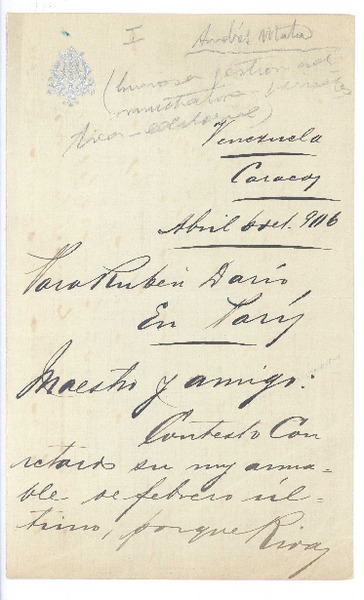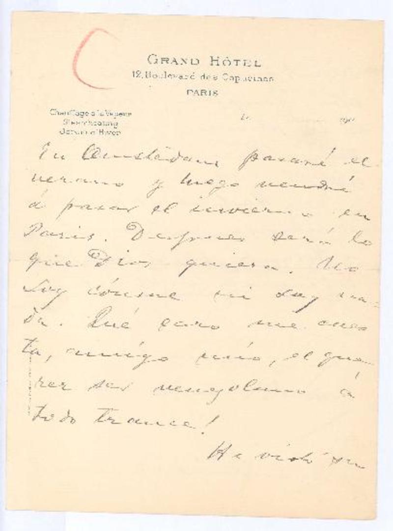 [Carta], c.1900 Paris, Francia <a> Rubén Darío [manuscrito] Armando Guido.