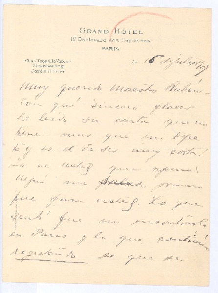 [Carta], 1896 Paris, Francia <a> Rubén Darío [manuscrito] Enrique Gómez Carrillo.