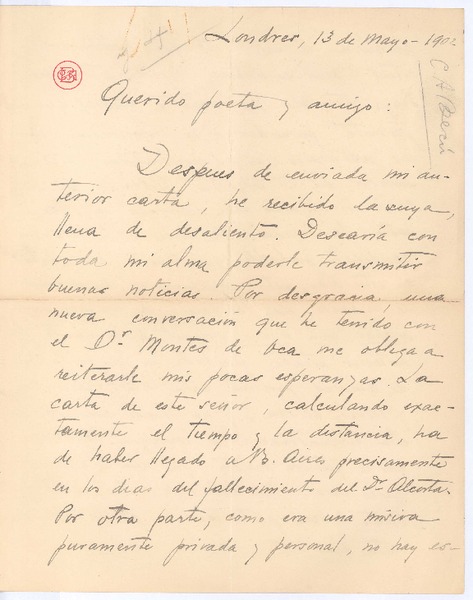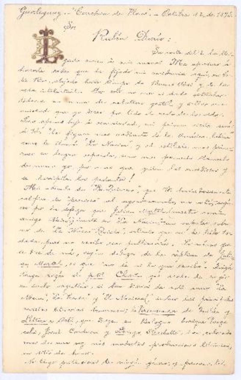 [Carta] 1893 oct. 12, Argentina [a] Rubén Darío [manuscrito] Luis Berisso.