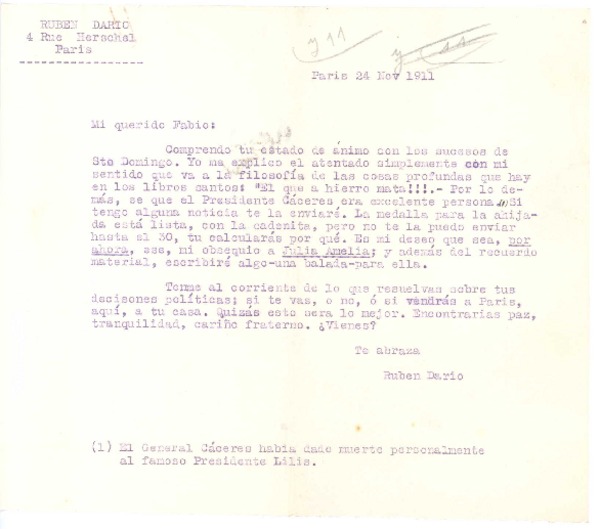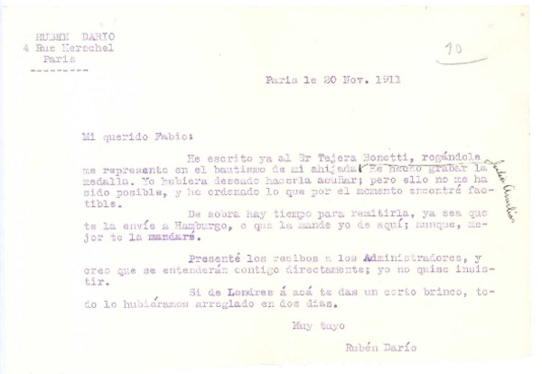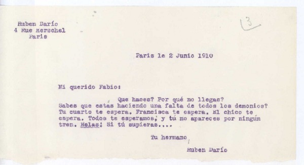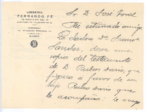 [Carta entre 1900 y 1916], España? <a> Rubén Darío [manuscrito] Fabio Fiallo.