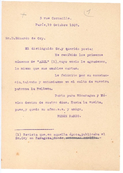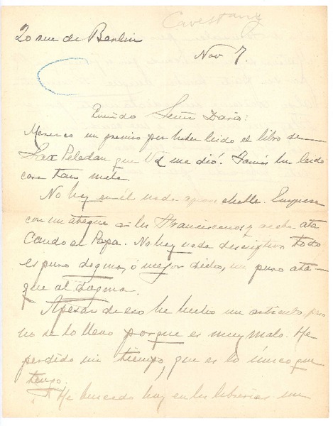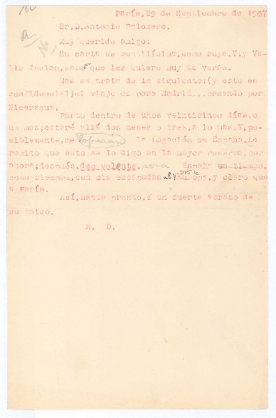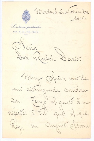 [Carta] [entre 1900 y 1916] nov. 7, Madrid, España [a] Rubén Darío [manuscrito] Pablo Cavestany.