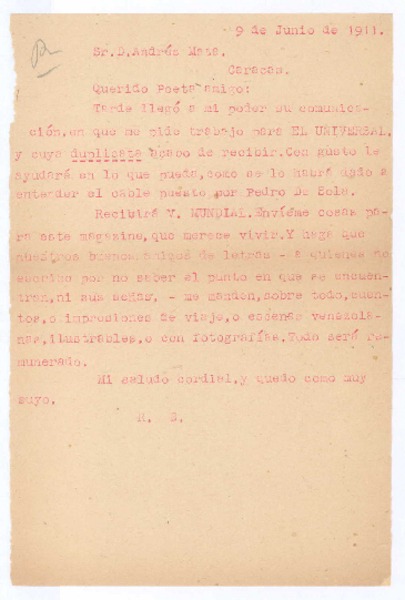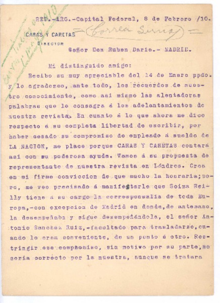 [Carta] [entre 1910 y 1916], Buenos Aires, Argentina [a] Rubén Darío [manuscrito] Enrique Caprile.