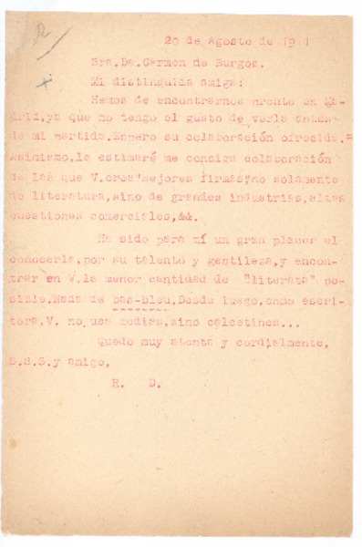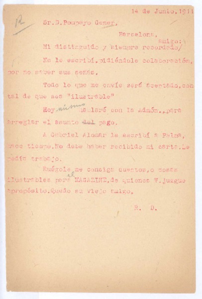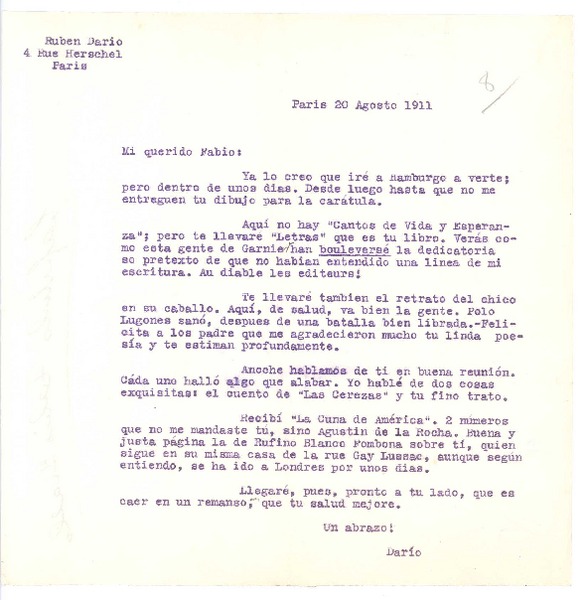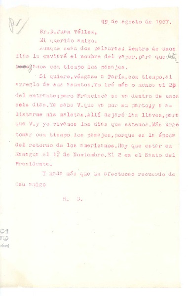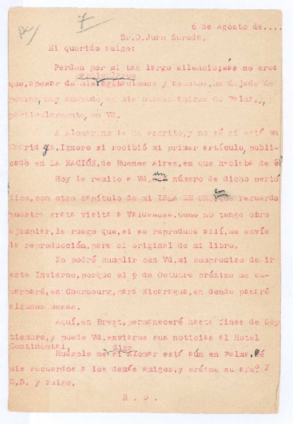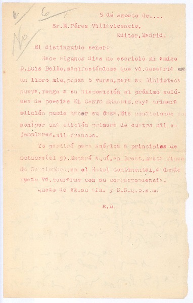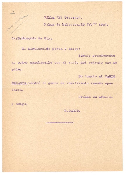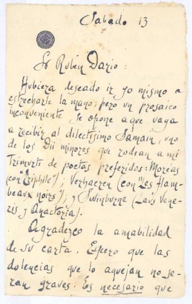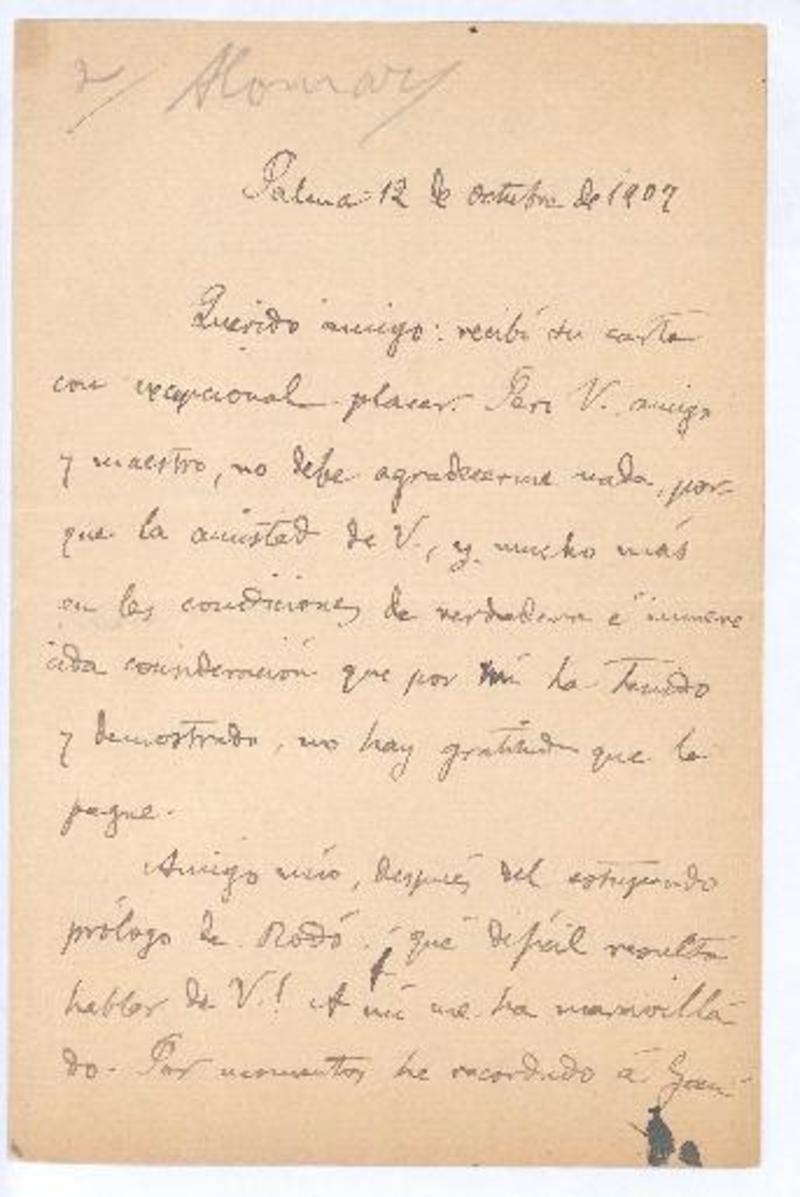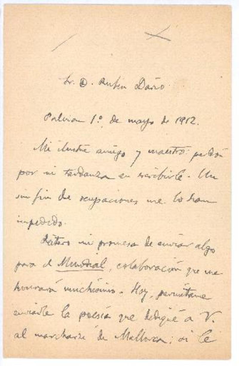 Palma, España [a] Rubén Darío, Carta, 1907 agosto 21, [manuscrito] Gabriel Alomar.