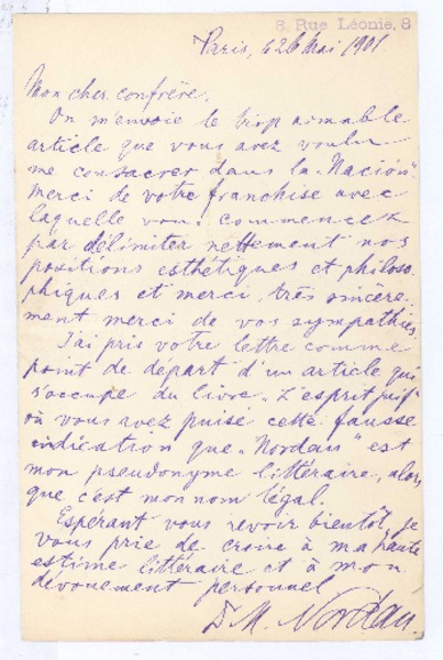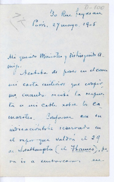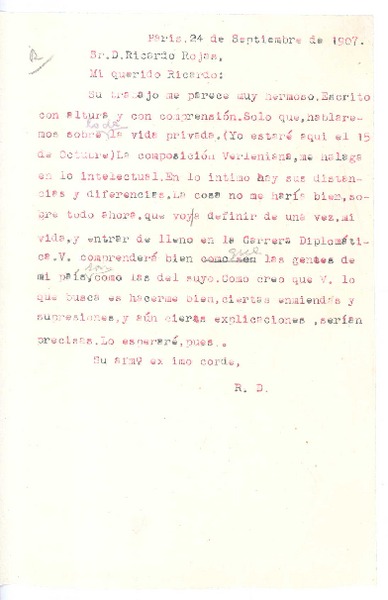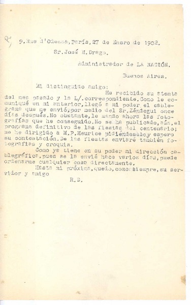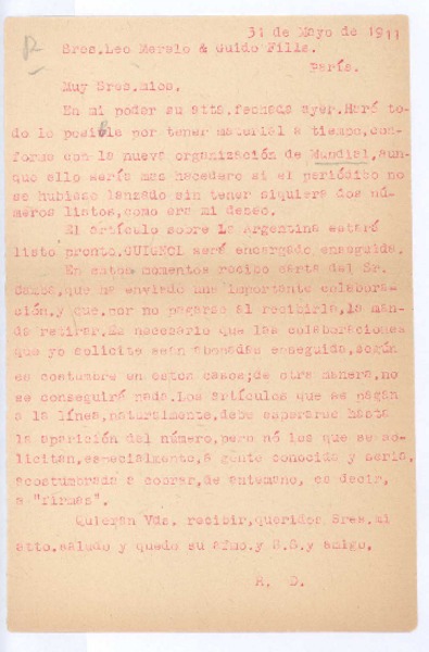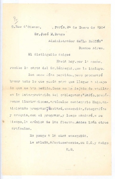 [Carta] [entre 1900 y 1916] París, Francia [a] Rubén Darío [manuscrito] Max Daireaux.