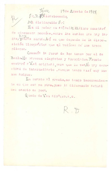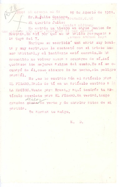 [Carta] 1901 ago. 19, Gran Bretaña [a] Tulio Cestero [manuscrito] Rubén Darío.