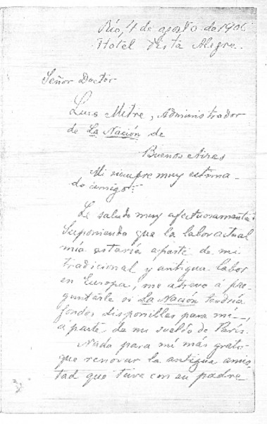 [Carta], c.1906 Sao Paulo, Brasil <a> Rubén Darío [manuscrito] Lugné Poe.