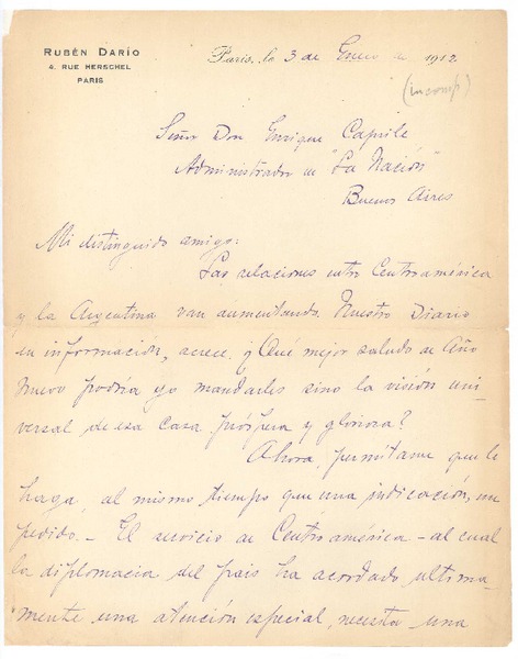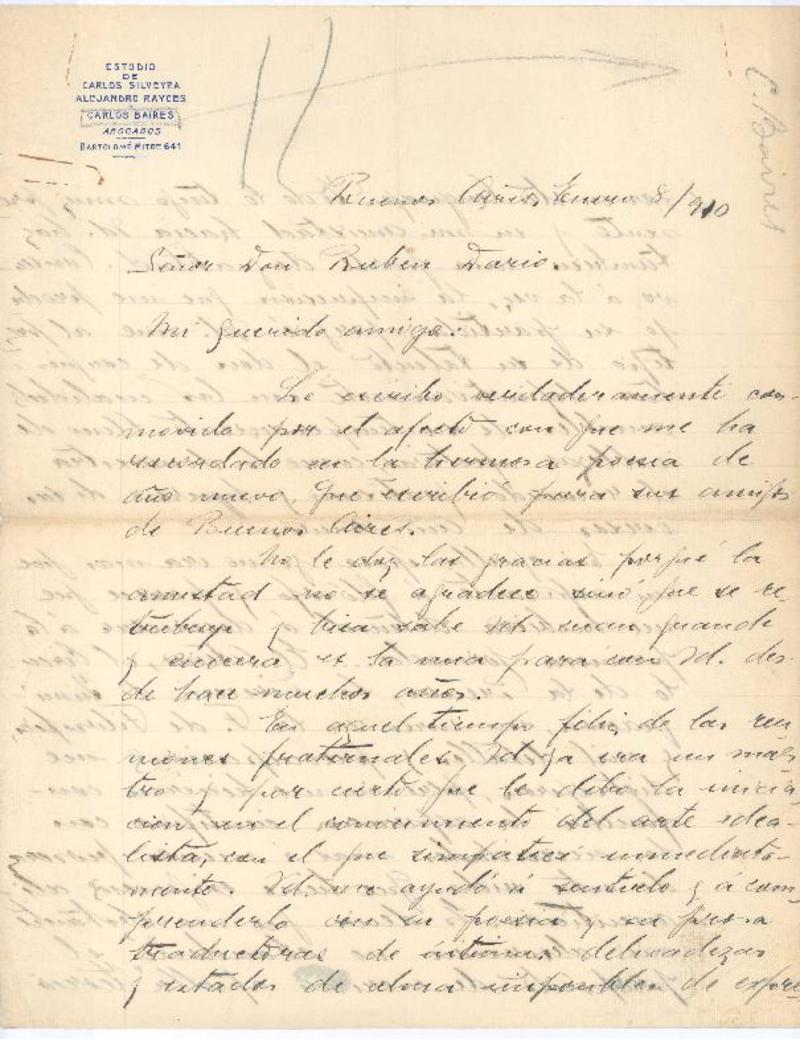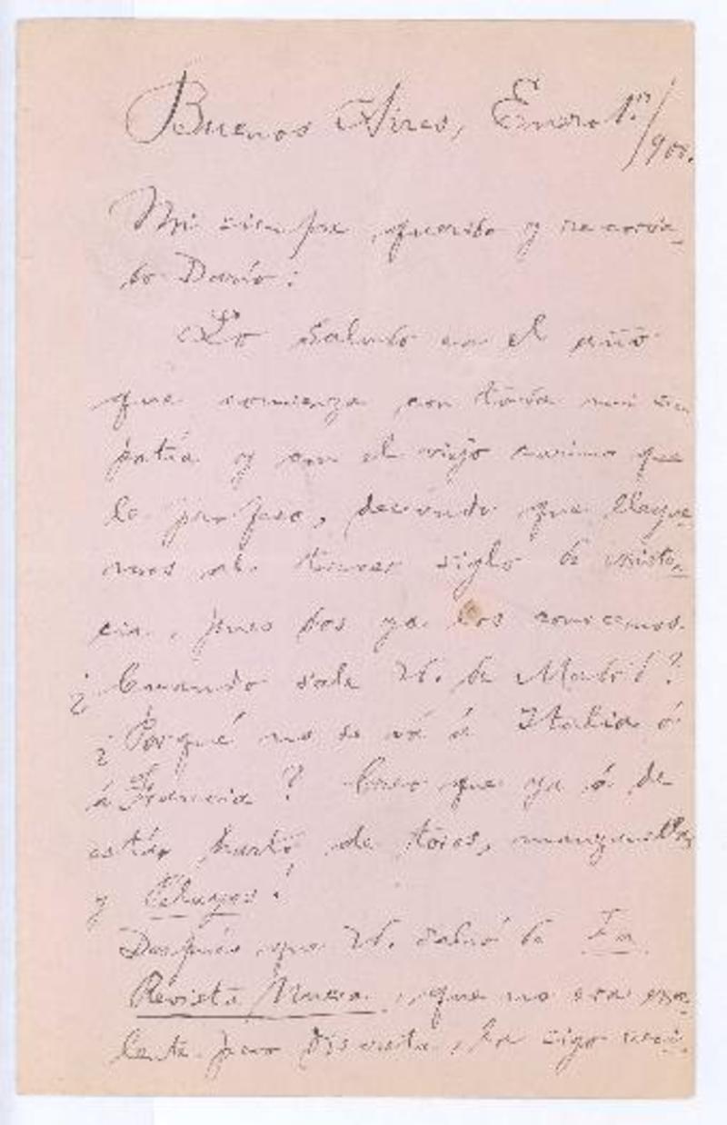 [Carta] 1900 ene. 1, Buenos Aires, Argentina [a] Rubén Darío [manuscrito] Luis Berisso.