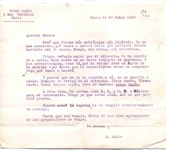 [Carta], 1899 jul. 4 Francia <a> Rubén Darío [manuscrito] Julio Piquet.