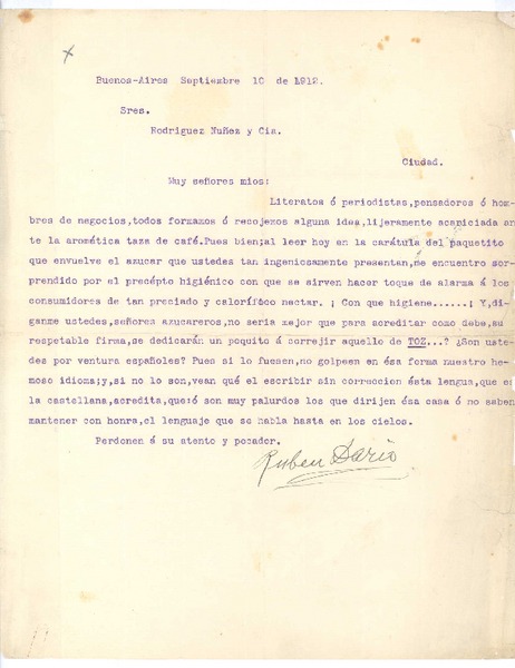 [Carta] 1899 sep. 12, Buenos Aires, Argentina [a] Rubén Darío [manuscrito] Luis Berisso.
