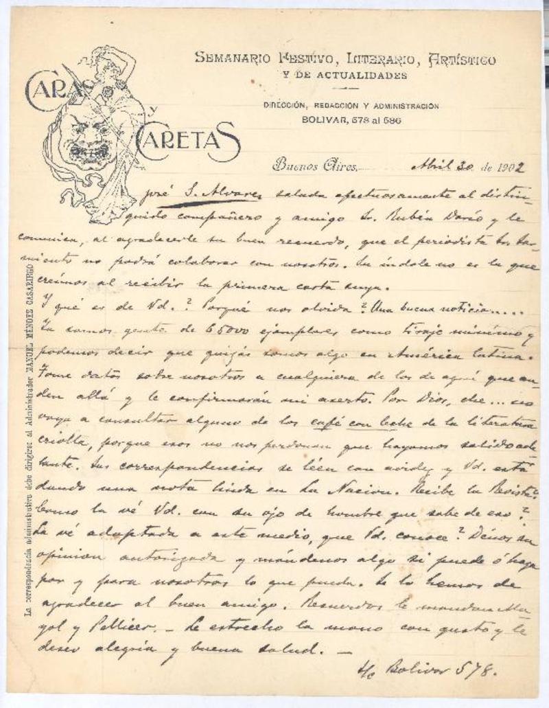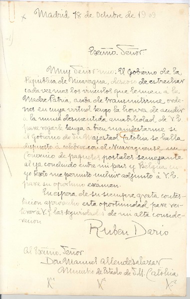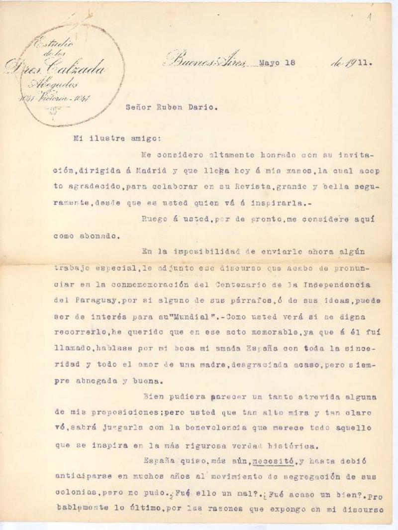 [Carta], c.1910 Argentina <a> José Santos Zelaya [manuscrito] Rubén Darío.