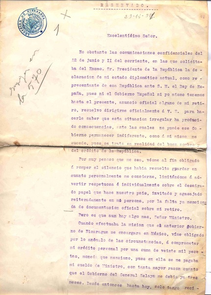 [Carta], 1891 Costa Rica <a Ministro de Nicaragua> [manuscrito] Rubén Darío.