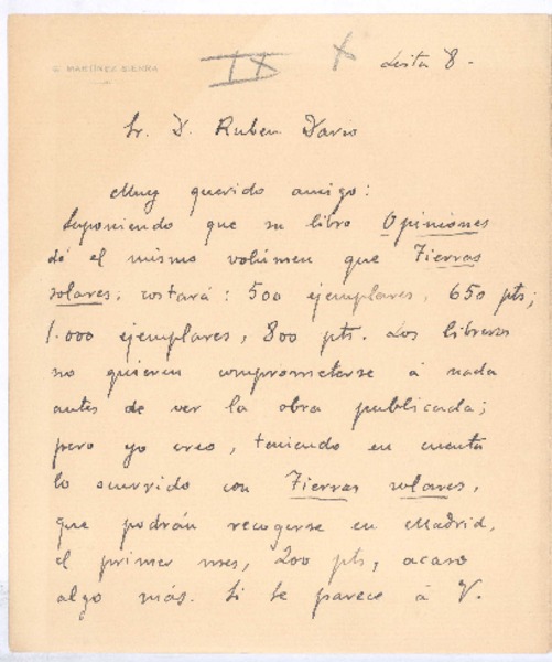 [Carta], c.1907 Madrid, España <a> Rubén Darío [manuscrito] Gregorio Martínez Sierra.