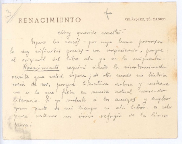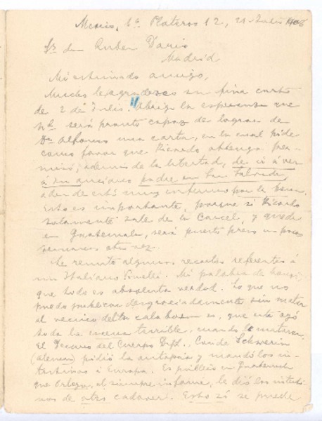 [Carta], c. 1903 Madrid, España <a> Rubén Darío [manuscrito] Juan Ramón Jiménez.