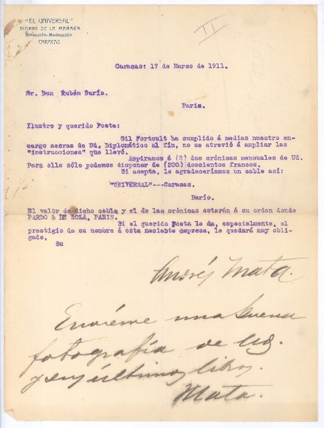 Correspondencia - Autores españoles - LLANAS AQUILANIEDO, JOSE MARIA - CORRESPONDENCIA - Manuscritos españoles - Darío, Rubén - Autores nicaragüenses