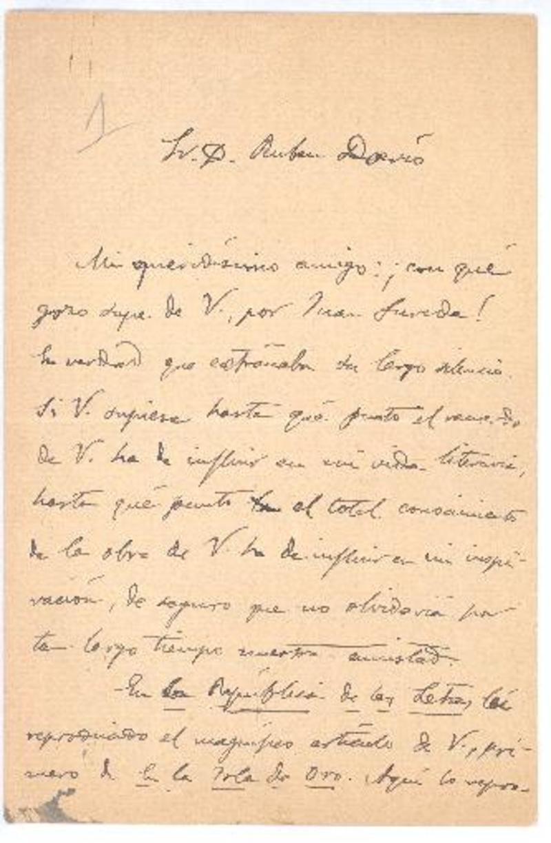 [Carta], c. 1906 España <a> Rubén Darío [manuscrito] Ramón Pérez de Ayala.