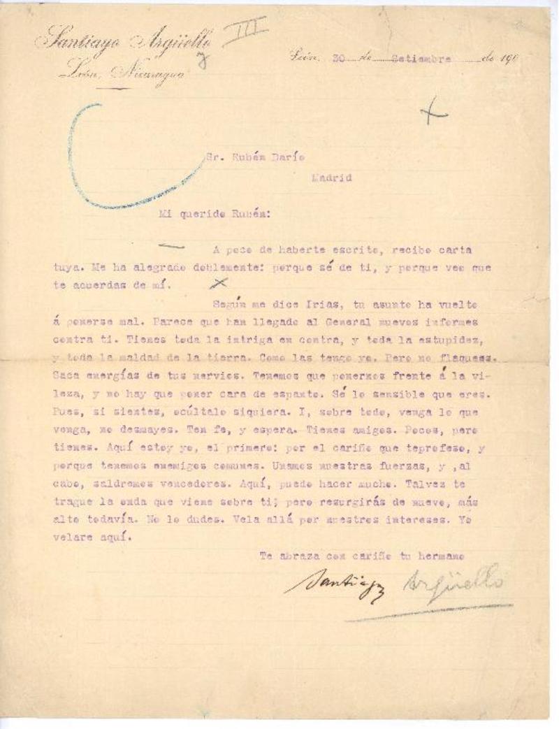 [Carta] [entre 1900 y 1909] sep. 30, León, Nicaragua [a] Rubén Darío [manuscrito] Santiago Arguello.