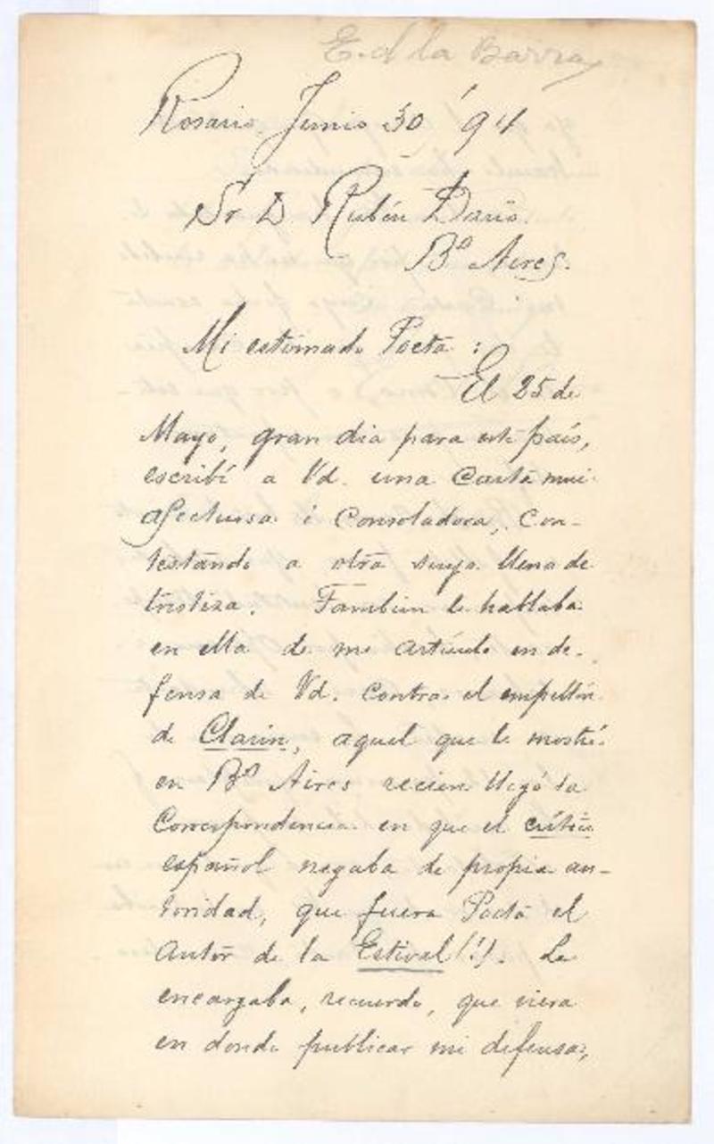 [Carta] 1894 jun. 30, Buenos Aires, Argentina [a] Rubén Darío [manuscrito] Eduardo de la Barra.