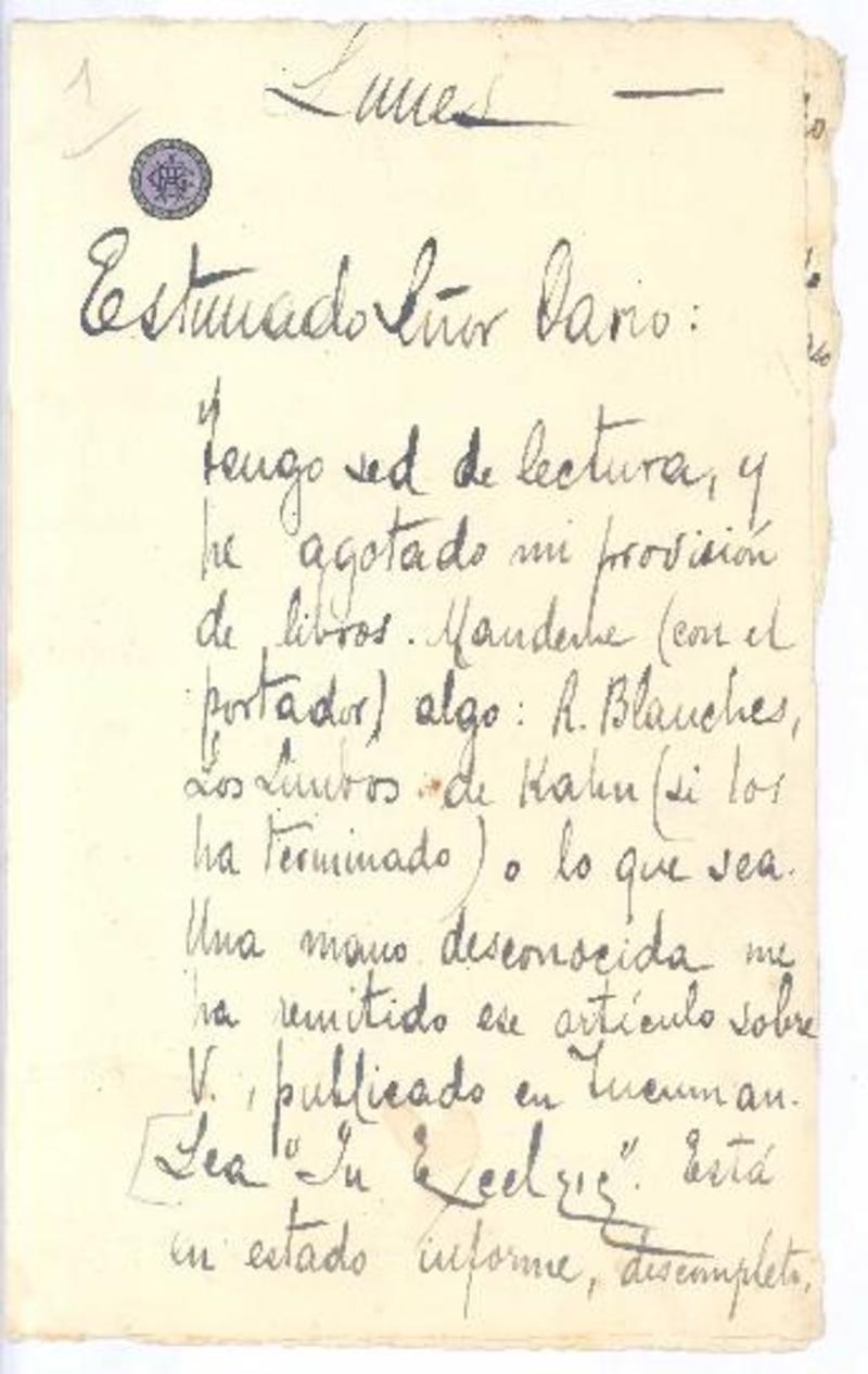 [Carta] [entre 1886 y 1916] lunes, [a] Rubén Darío [manuscrito] Carlos Alfredo Becú.