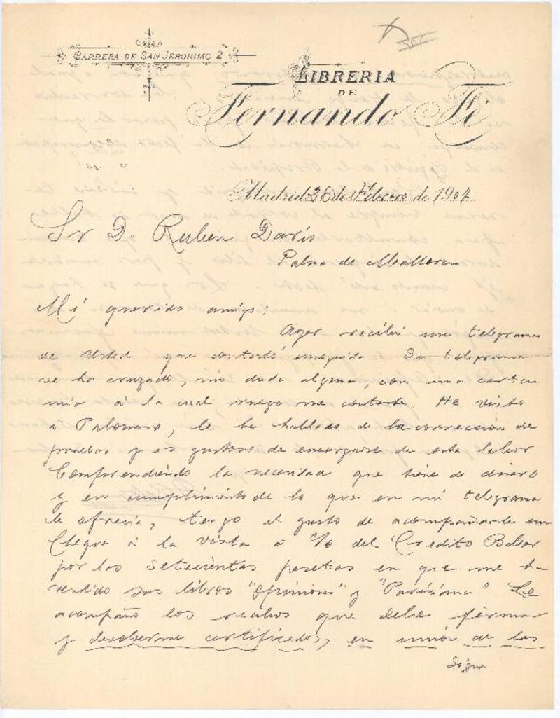 [Carta], 1900 dic. 8 Madrid, España <a> Rubén Darío [manuscrito] Francisco Villaespesa.