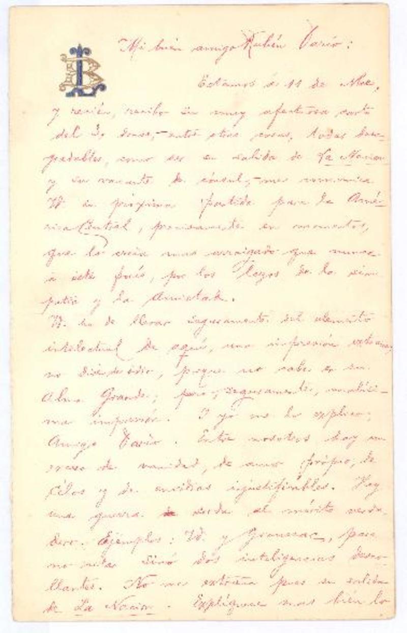 [Carta] [entre 1890 y 1899], Nicaragua [a] Rubén Darío [manuscrito] Santiago Arguello.