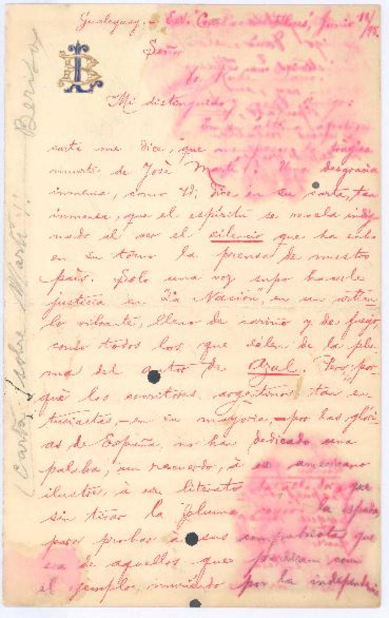 [Carta] 1895 jun. 18, Gualeguay, Argentina [a] Rubén Darío [manuscrito] Luis Berisso.