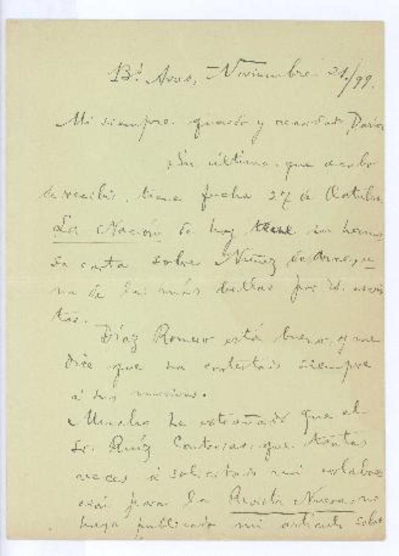 [Carta] [entre 1899 y 1900] nov. 11, Buenos Aires, Argentina [a] Rubén Darío [manuscrito] Luis Berisso.