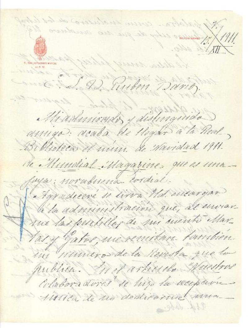 [Carta], 1894 nov. 30 Lima, Perú <a> Rubén Darío [manuscrito] Ricardo Palma.