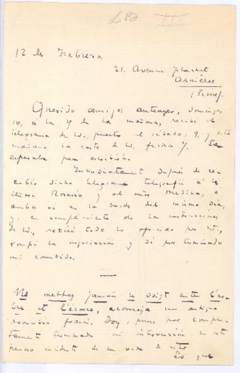 [Carta] [entre 1910 y 1916] feb. 12, París, Francia [a] Rubén Darío [manuscrito] Luis Bonafoux.