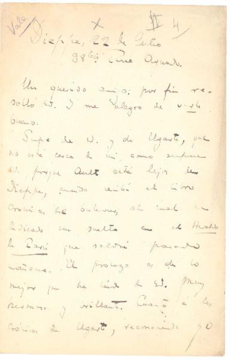 [Carta] [entre 1910 y 1916] jul. 22, Dieppe, Francia [a] Rubén Darío [manuscrito] Luis Bonafoux.