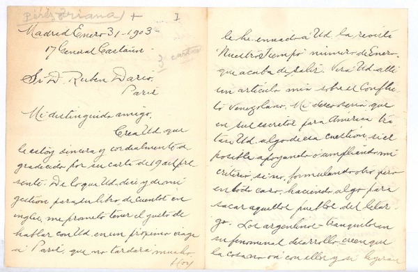 [Carta], 1903 ene. 31 Madrid, España <a> Rubén Darío [manuscrito] Santiago Pérez Triana.