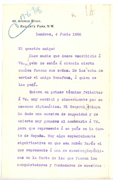 [Carta], 1908 jun. 4 Londres, Inglaterra <a> Rubén Darío [manuscrito] Santiago Pérez Triana.
