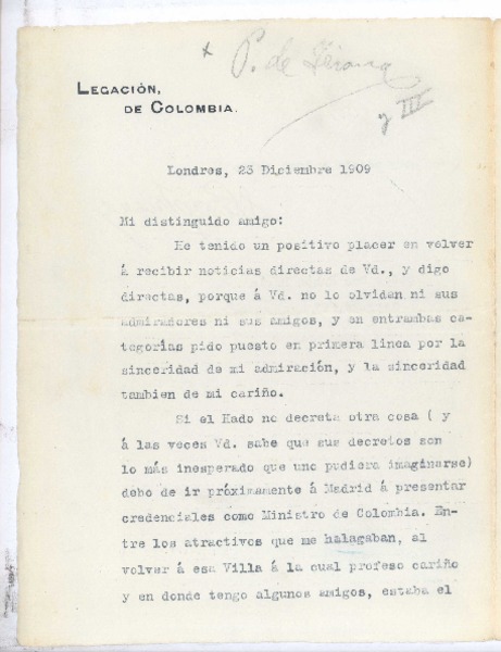 [Carta], 1909 dic. 23 Londres, Inglaterra <a> Rubén Darío [manuscrito] Santiago Pérez Triana.