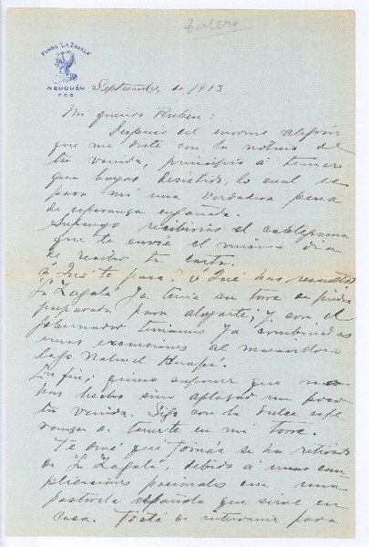 [Carta], 1913 septiembre, Neuquén, Argentina <a> Rubén Darío [manuscrito] Eduardo Talero Núñez.