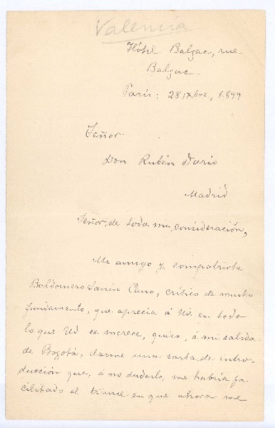 [Carta], 1899 oct. 28 Paris, Francia <a> Rubén Darío [manuscrito] Guillermo Valencia.