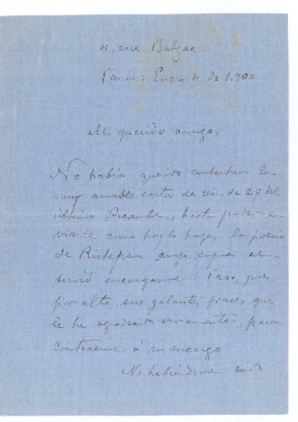 [Carta], 1900 ene. 4 Paris, Francia <a> Rubén Darío [manuscrito] Guillermo Valencia.